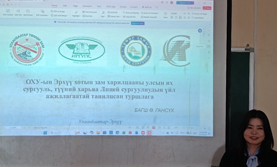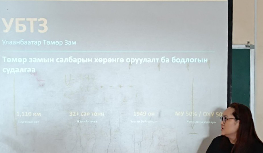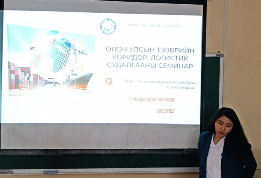 “Тээврийн коридор, логистик ба олон улсын болон үндэсний төмөр замын бодлого, стандартчилал” судалгааны семинар амжилттай зохион байгуулагдлаа. Багш, судлаачид олон улсын тээврийн коридор, Улаанбаатар хотод ачаа тээврийн төрөлжсөн логистикийн төв байгуулах, аюултай ачааг тээвэрлэх ADR-т Монгол Улс хэрхэн нэгдэх, агуулахын үйл ажиллагаанд "Яг цагт нь систем"- ийг хэрэгжүүлснээр вагон эргэлтийг хурдасгах боломж, "УБТЗ" ХНН-ийн салбарын хөрөнгө оруулалт, бодлогын талаарх судалгааны ажлуудаа хэлэлцүүлж, асуулт хариулт өрнөсөн хэлэлцүүлэг боллоо. Мөн ОХУ-ын Эрхүү хотын төмөр замын харьяа бүх шатны сургуулиудад зочлон, туршлага судалсан тухай сонирхолтой танилцуулга хийлээ.