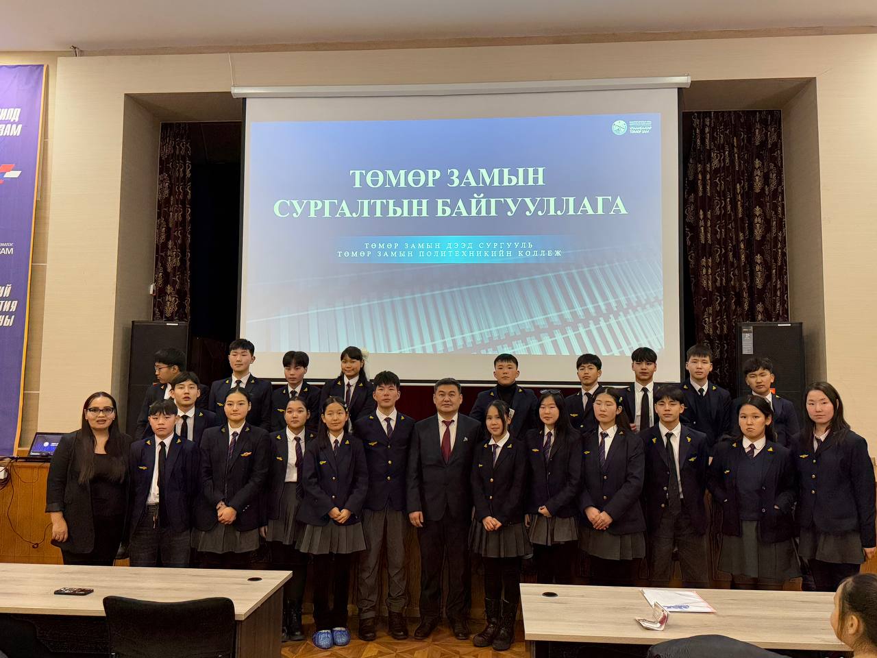“УБТЗ” ХНН-тэй хамтын ажиллагаатай Сэлэнгэ аймгийн ерөнхий боловсролын нэгдүгээр сургуулийн ахлах ангийн сурагчид Төмөр замын дээд сургуулийн үйл ажиллагаатай нэгдүгээр сарын 31-ны өдөр танилцлаа. Сурагчдад төмөр замын үндсэн мэргэжил бакалавр, техникчийн хөтөлбөр, мэргэжлийн боловсролын тухай мэдээлэл өгч, тэдний саналыг сонссон юм. Энэ удаагийн уулзалт, танилцуулгыг Төмөр замын дээд сургуулийн захирал, доктор С.Галбадрах, Суурь бүтцийн тэнхимийн эрхлэгч Ц.Мөнхбаяр, цахилгаан хангамж хөтөлбөрийн ахлагч, багш З.Отгонзул, Вагоны аж ахуй хөтөлбөрийн багш О.Уянга нар мэргэжлийн онцлог, салбарын талаар танилцуулга хийлээ. Сургуулийн захирал С.Галбадрах тэдэнд хандаж хүссэн мэргэжлээрээ суралцаж чадварлаг боловсон хүчин болохыг захиж, сурлагын амжилт хүслээ.