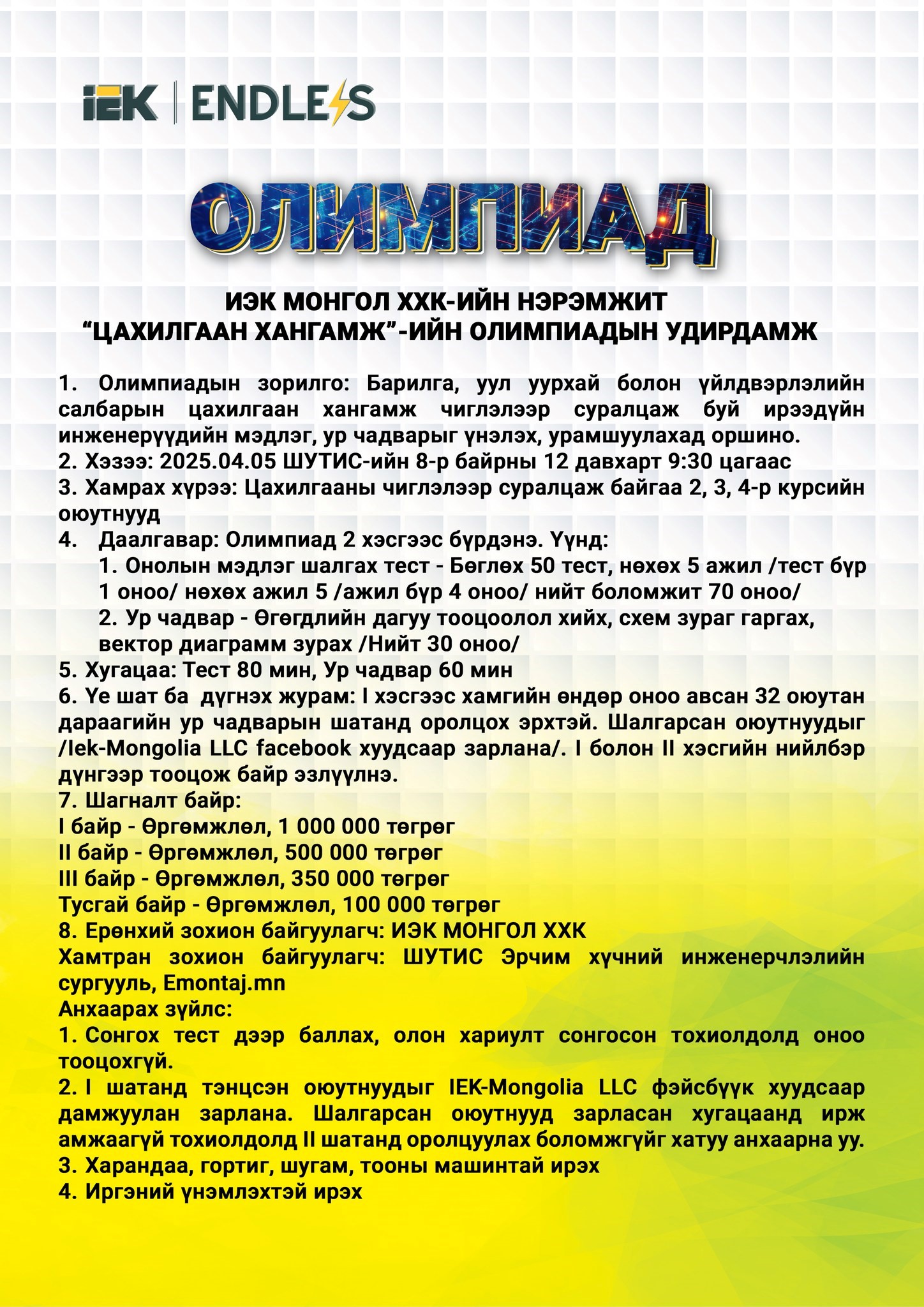 2025 оны 4 дүгээр сарын 5-ны өдөр ШУТИС-ийн Эрчим хүчний сургууль дээр ИЭК Монгол ХХК-ийн нэрэмжит “Барилга, уул уурхайн цахилгаан хангамж”-ийн олимпиад амжилттай зохион байгуулагдлаа. Тус олимпиад нь мэргэжлийн чиглэлийн гүнзгийрүүлсэн мэдлэг, ур чадварыг сорьж, шилдэг оюутнуудыг тодруулдаг нэр хүндтэй тэмцээн юм.