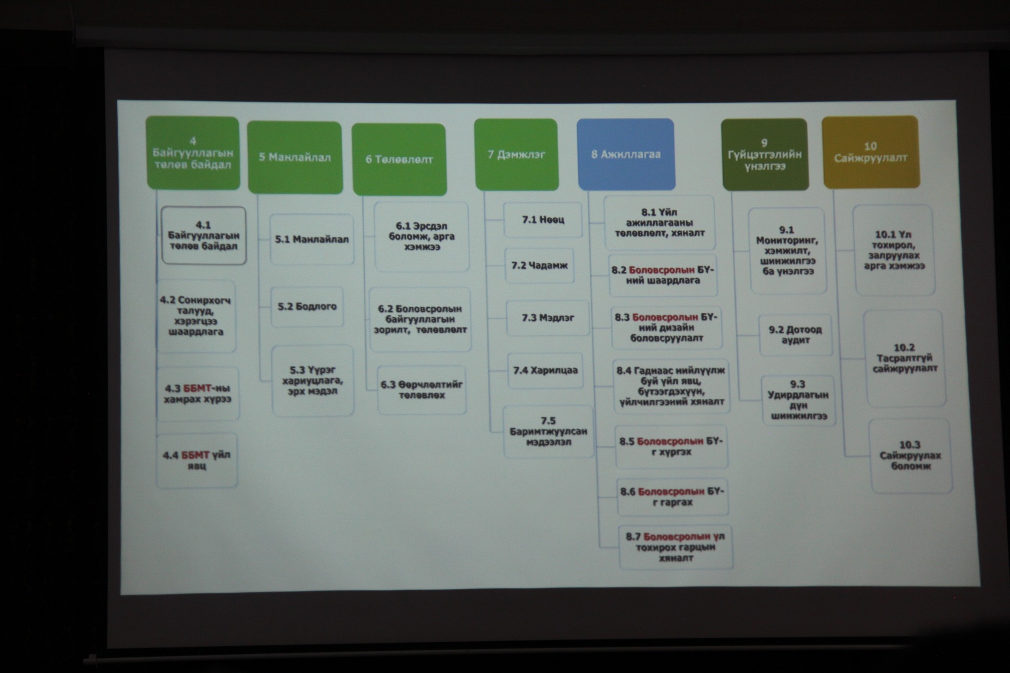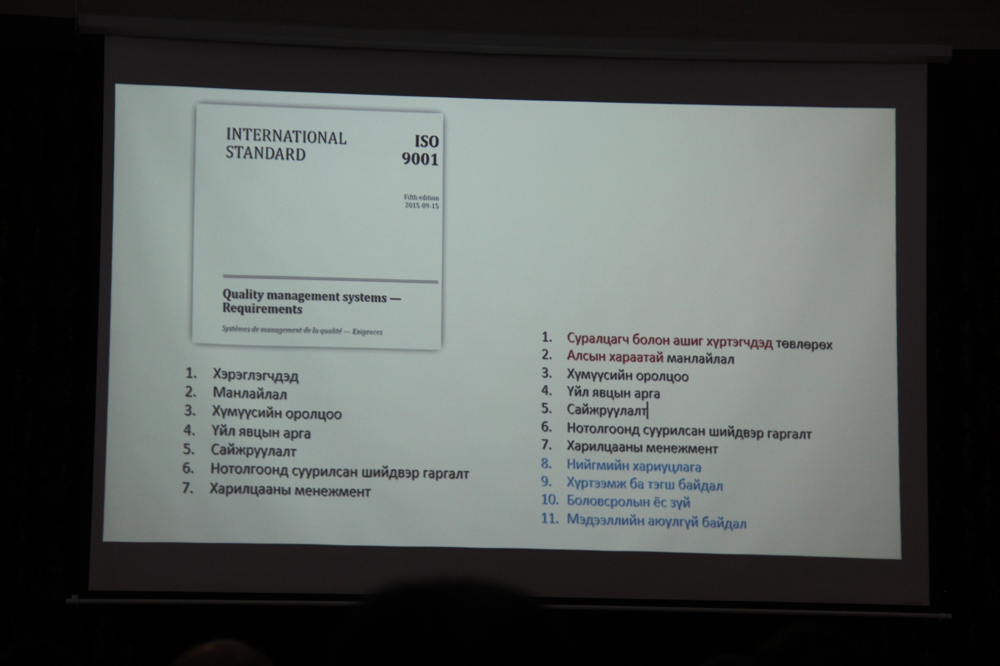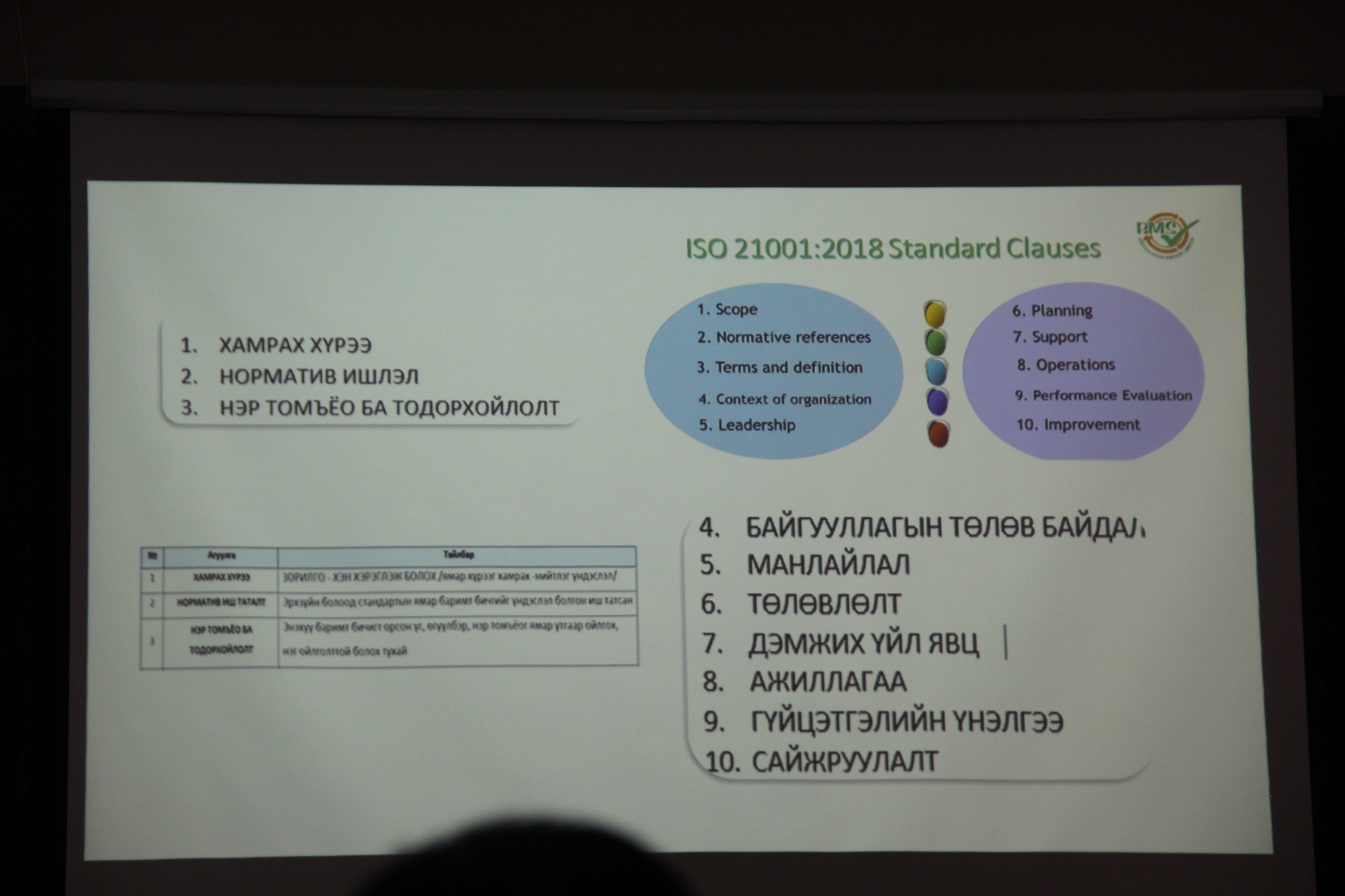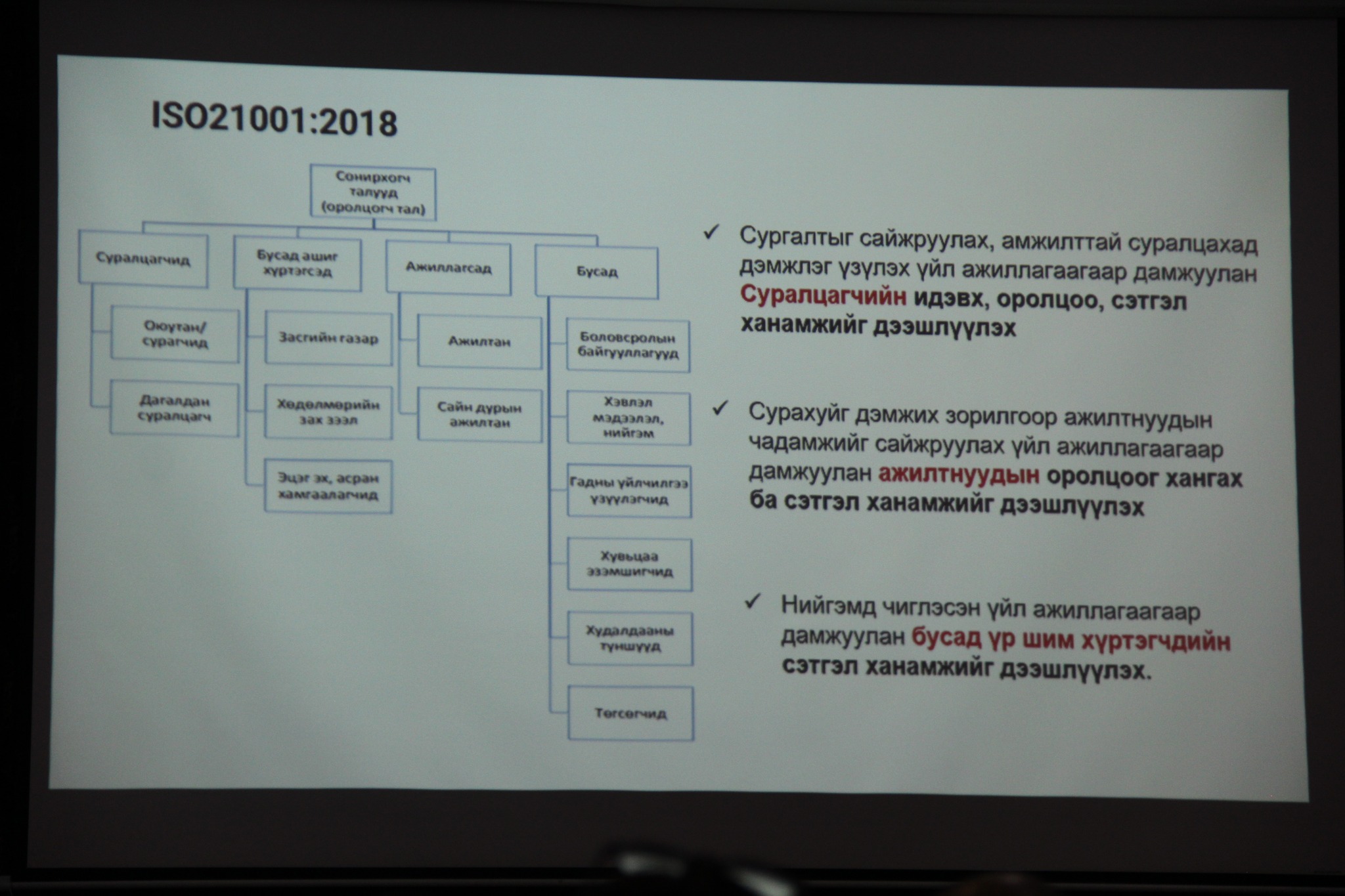 Сургалтын үеэр ISO 21001:2018 стандартыг хэрэгжүүлэхэд удирдлагын манлайллын ач холбогдол, хамт олны оролцооны үр нөлөө, байгууллагын чанар, гүйцэтгэлийг сайжруулахад чиглэсэн бодлого, үйл ажиллагааны талаар онцлон хэлэлцлээ.